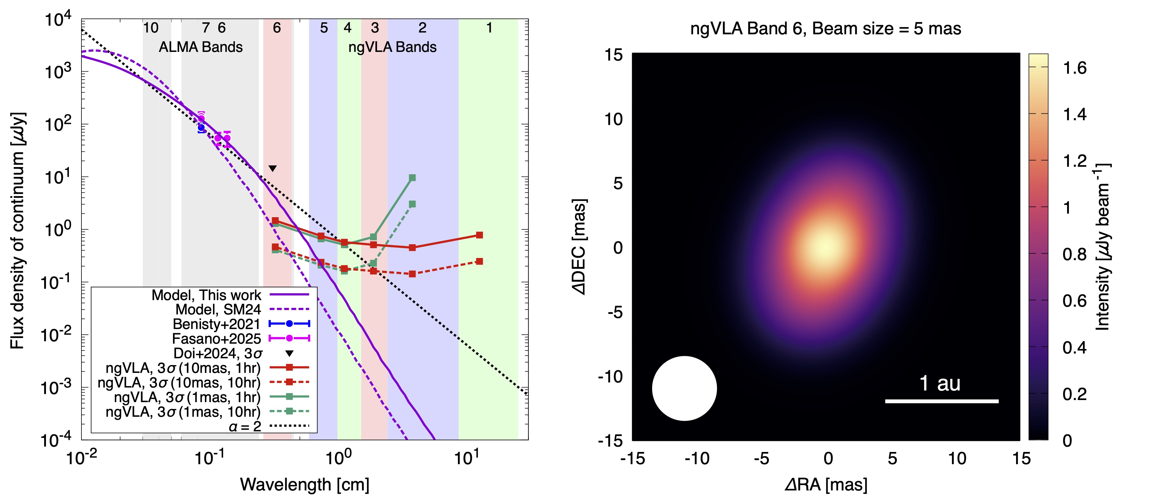 Figure: Predictions of the dust thermal emission from PDS 70 c, a gas-accreting planet. (Left) ngVLA detectability. (Right) ngVLA imaging. Credit: Shibaike et al. (2025)