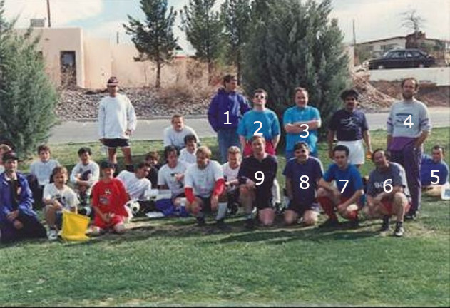 About this month's photograph - In the early 1990s in Socorro there were several Commonwealth and European staff members interested in competing in the New Mexico Tech intramural soccer competition. A group of NRAO-NM people played on the team, supplemented by visiting astronomers and occasionally the family members of NRAO staff. Known IDs (and their current positions): 1 - Kevin Marvel (AAS CEO); 2 - Bill Junor (Scientist, Los Alamos National Lab); 3 - Phil Diamond (SKA Director General); 4 - Angelos Vourlidas (Astrophysicist, Johns Hopkins University Applied Physics Laboratory); 5 - a relaxed Tony Beasley (NRAO Director); 6 - Leonid Kogan (NRAO staff member - deceased); 7 - Andrei Lobanov (Senior Staff Astronomer, MPIfR Bonn); 8 - John Conway (Director of the Onsala Space Observatory); 9 - Gustaaf van Moorsel (NRAO staff member - retired); Gustaaf's son is seated at left holding the flag. The photo was taken on the south side of NM Tech Field. NRAO staff at all sites have organized and participated in a wide variety of sports, including basketball, golf, skiing, and even cricket.