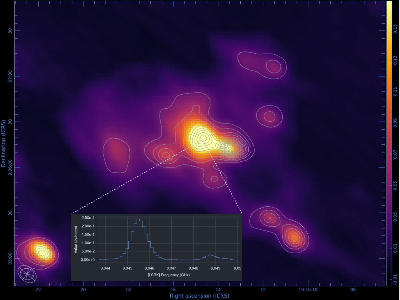 This figure (left) shows a peak intensity image of the Hydrogen (93) alpha recombination line at 8.0456 GHz toward W49 taken by the VLA in D-configuration, from program 15A-089 (PI: C. De Pree). The inset spectrum shows both the aforementioned Hydrogen line and the adjacent Helium (93) alpha recombination line at 8.0489 GHz. The contours highlight the X-band continuum data tracing free-free emission in the region. The spectral line data were automatically processed by the VLA calibration and imaging pipeline in CASA 6.6.6-17-pipeline-2025.1.0.32. Click the image to enlarge.