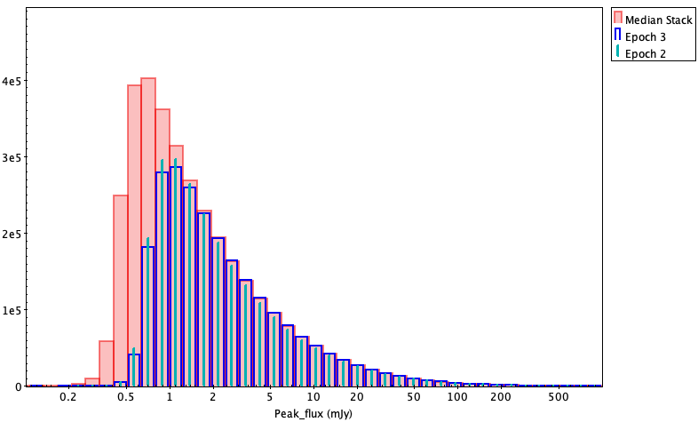 Figure (left): A comparison of the counts of detected source components in Quick Look images from Epoch 2 (green spikes), Epoch 3 (open blue histogram) and the median stack (red filled histogram). The increase in counts below the limits of the Epoch 1 and 2 catalogs shows the improved sensitivity of the 3-epoch median stacked images.