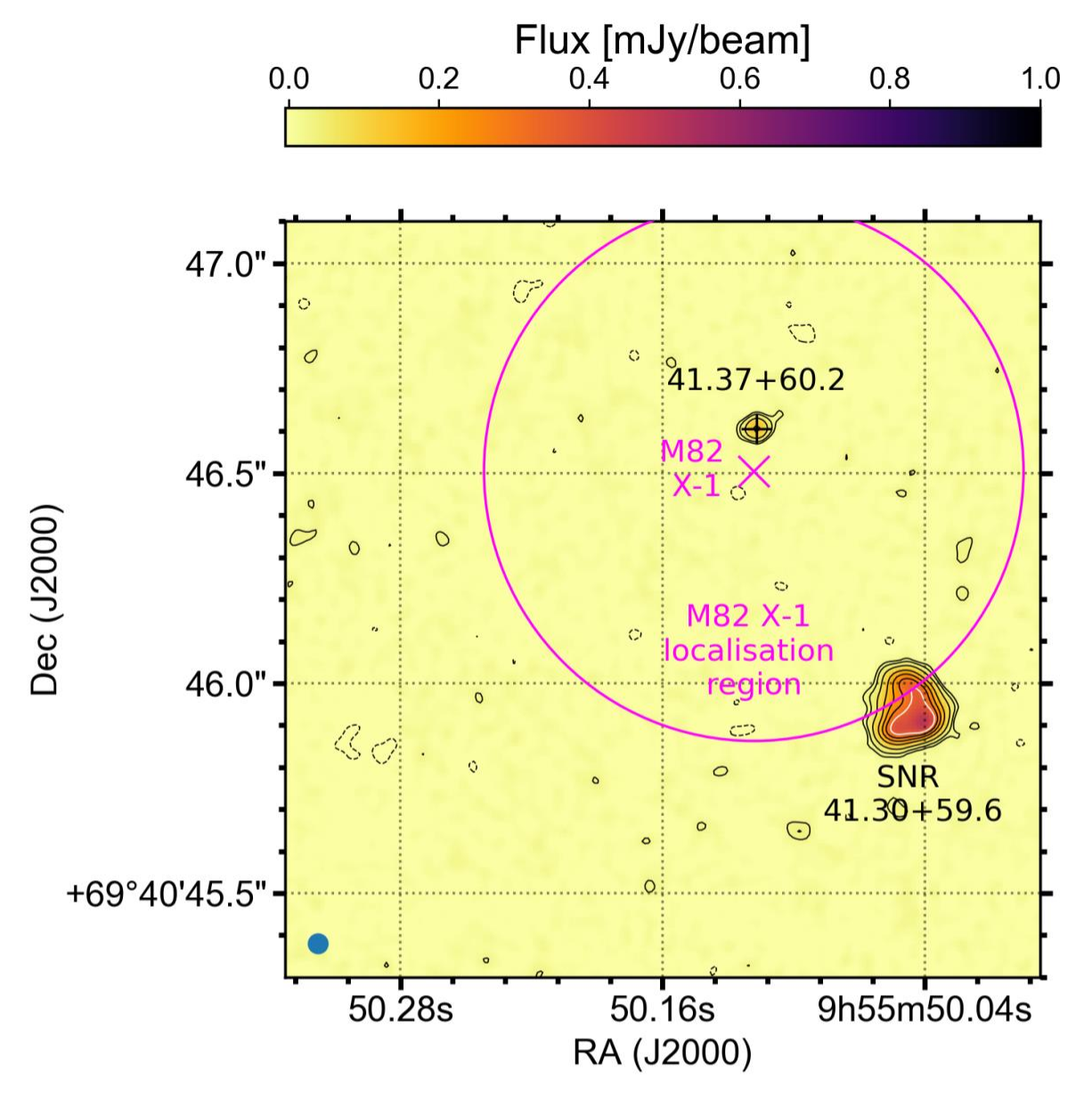 Figure: e-MERLIN 5-6 GHz image from 2015 near the IMBH candidate M82 X-1 (magenta x and 3-sigma localization region). Contours show the new e-MERLIN radio source, 41.37+60.2, later detected by the EVN+e-MERLIN (black +). The well-known SNR 41.30+59.6 is just beyond the localization region of M82 X-1 (Xu et al. 2015). Adapted from Williams-Baldwin et al. (2025).