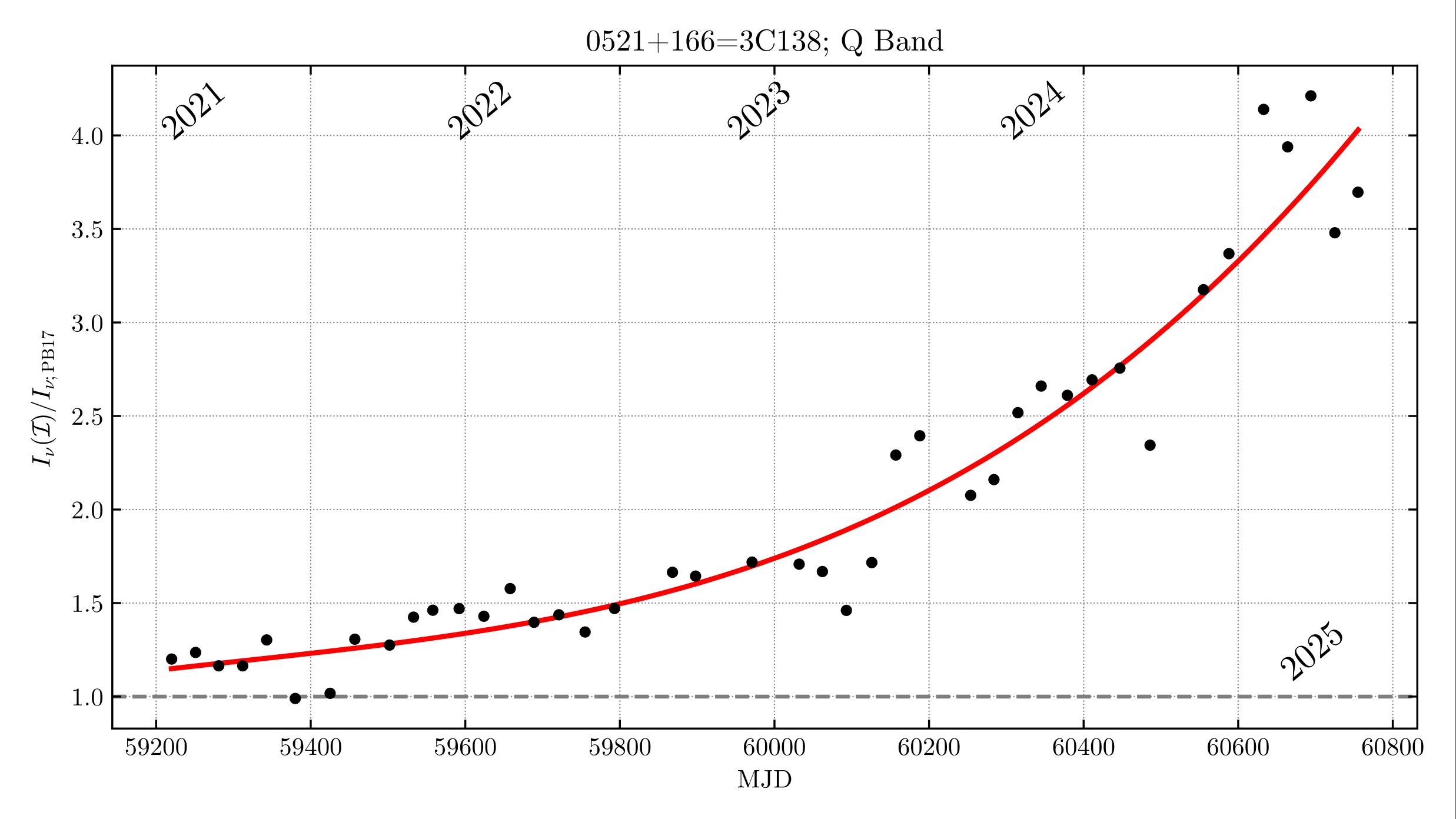 VLA measured Stokes I at Q Band from the TCAL0009 program relative to the Perley & Butler (2017) (black points) from Jan. 2021 to Apr. 2025. Scaling factors are evaluated on a monthly basis from a smooth spline fit to the data (red curve). Click to enlarge.