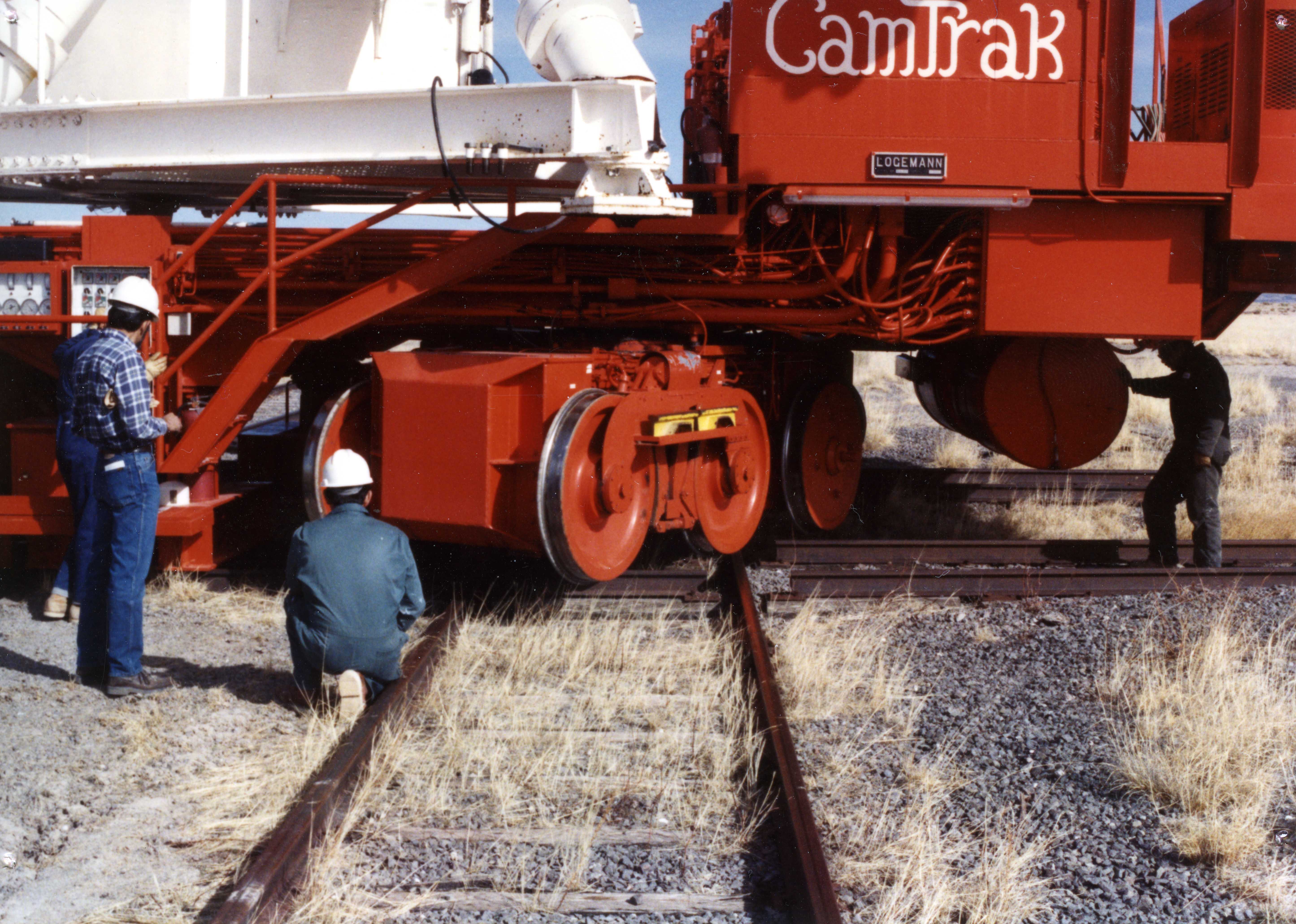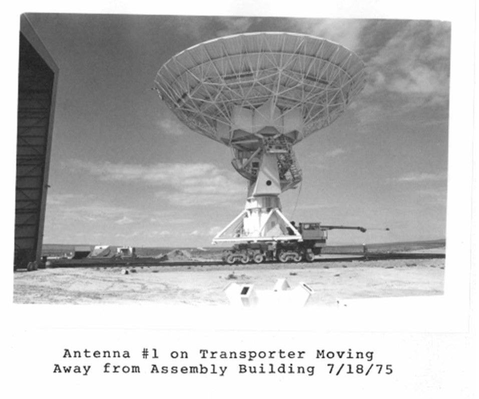 About this month's photographs: Top photo - The very first move of a VLA antenna was 50 years ago, on 18 July 1975, when the transporter moved Antenna #1 away from the Assembly Building. In the bottom photo, taken during the 1000th VLA antenna move on 26 February 1991, CamTrak (AKA Transporter #2) lifts its wheels to turn onto the rail spur to bring antenna 15 towards station DN9, its new location. The transporters are crucial to making the VLA a flexible instrument operating in multiple configurations. A February 11, 1977 memo states, "We tend to underestimate the complexity of the design and construction of the vehicle, which picks up 220-ton antennas and transports them through 90[deg] intersections. That it works as well as it does is an engineering achievement of the first order...." Transporter #1 was named Hein's Trein, honoring long-time NRAO Associate Director Hein Hvatum; Transporter #2, CamTrak, honored Campbell Wade, who helped design the VLA and led the search for and acquisition of the VLA site. Current transporter names are Jack of Diamonds and High Plains Lifter. See additional photographs of the 1000th move; see also a YouTube video explaining how the transporters move the antennas to reconfigure the array.
