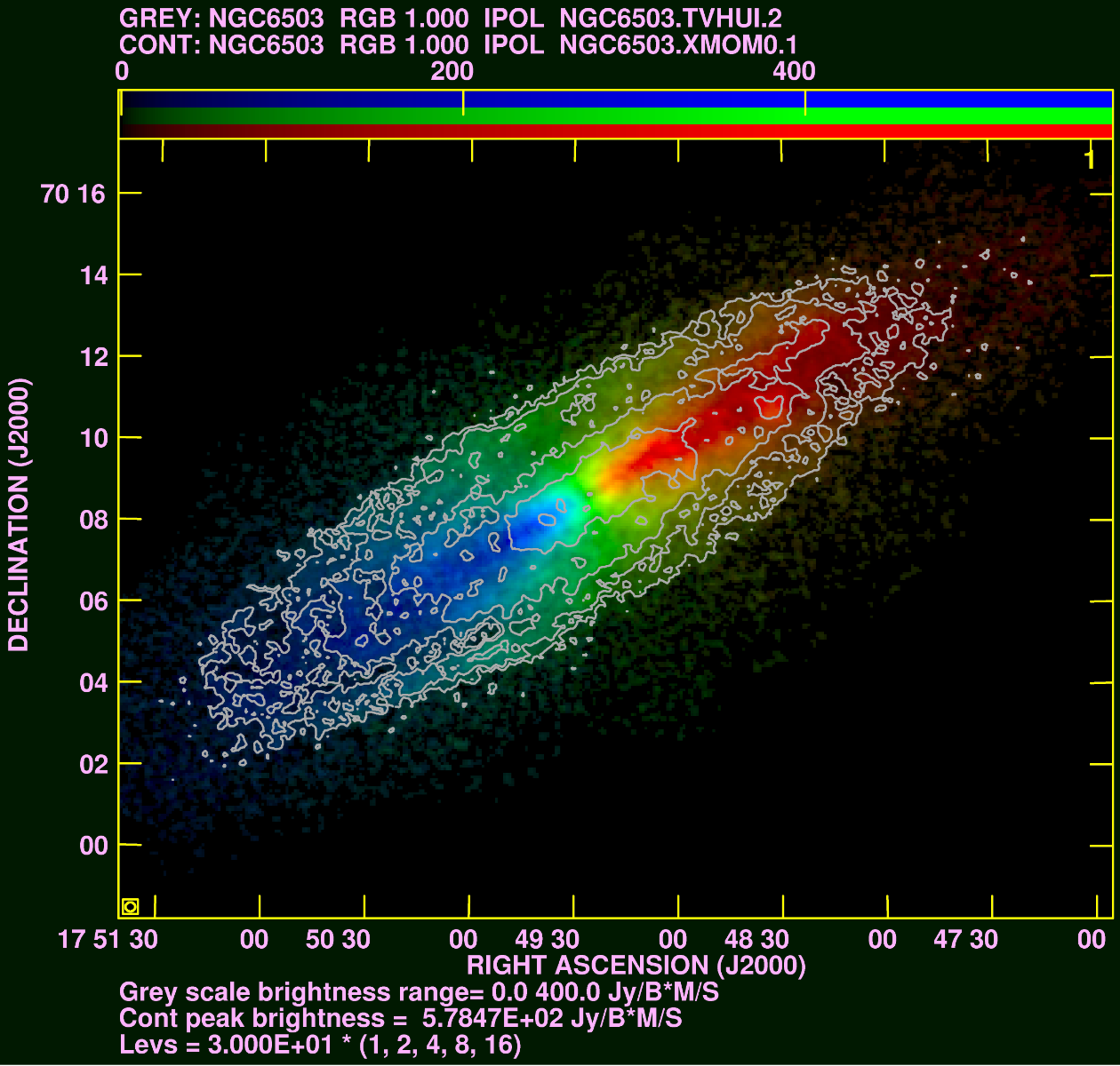 Figure below, right, from the AIPS Cookbook: One of the many tasks in AIPS that has contributed to countless scientific results over four decades. KNTR interprets the output of TVHUI as a three-color RGB image and overlays moment-0 contours. LWPLA adds coloring to the lines, using a less than pure white for both bright and dark contours so that they are not so dominant. Data courtesy of Eric Greisen, Kristine Spekkens, and Gustaaf van Moorsel.