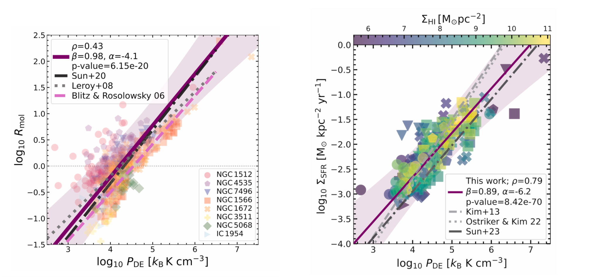 Figure above left: Rmol against PDE. Shown here is an enlarged version of panel 5 from Figure 9, with the fit now performed over the entire sample (purple line) with the corresponding 3σ confidence interval (purple shaded region). The black, grey, and pink lines show literature fits adopted from Sun et al. (2020a), Leroy et al. (2008), and Blitz & Rosolowsky (2006), respectively.
