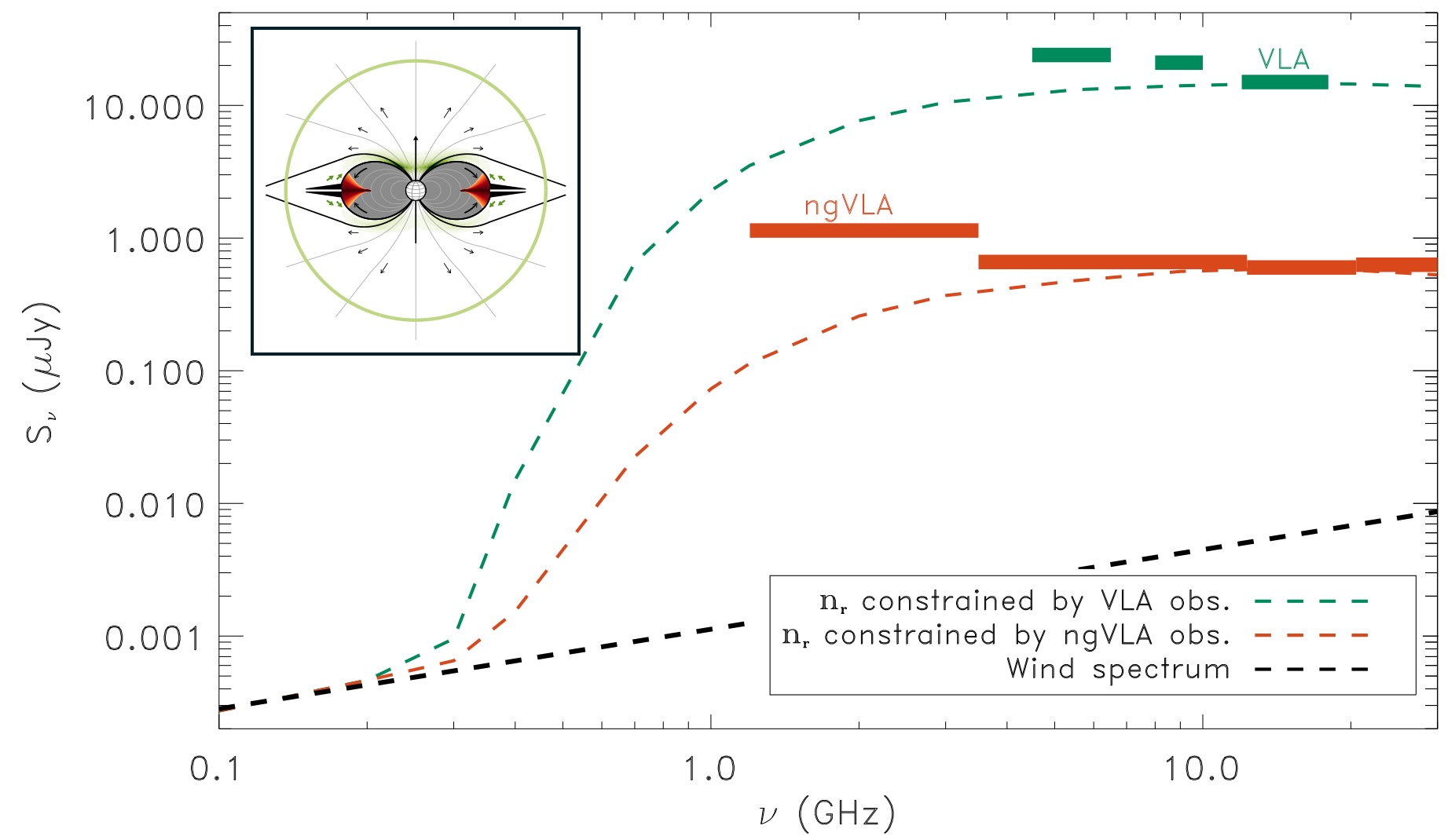 Figure: Dashed lines show model predictions for the radio spectra of the magnetic WR star in the HD45166 binary system. Bars show current VLA or expected ngVLA constraints. Insert shows a cartoon of the adopted magnetospheric model. Adapted from Leto et al. (2025). Click to enlarge.