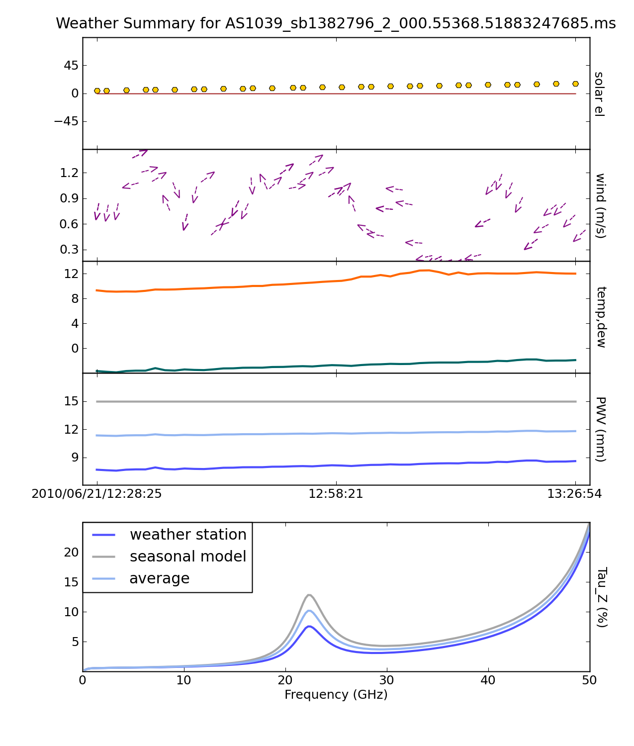 - Zenith optical depth from 1-50 GHz, calculated for each of the above three estimates of PWV, averaged over time. This calculation uses the atmospheric toolkit available within casa (see help(at) within CASA for more info)