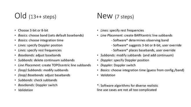 This RCT2.0 was created after a staff presentation in early 2017 where the current (old) way of generating a line resource in the OPT/RCT using the implemented telescope hardware point of view requiring at least 13 steps, depending on how good the initial guess for setting the baseband center was was summarized. This was compared to a desired (new) way with only 7 steps and without any required guess work and accompanying confusions and frustrations. Here the telescope hardware iterative back-and-forth fine-tuning, causing potential undesired shifting of frequency coverage (and missing the targeted line) could be replaced by a science point of view without the observer having to worry about the hardware specific limitations from the start. The final summarizing slide is reproduced below to indicate the targeted changes in RCT2.0 presented here: