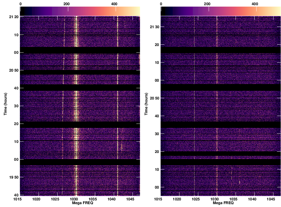 To address any differences due to observing on two days, such as wide-band satellite transmissions that may have a different impact from one day to another as seen below, but which cannot be removed by the RFI blanking technique, an observing session that includes both RFI blanked and non-blanked subbands spanning the same frequency ranges will be carried out, albeit with a lower spectral resolution.