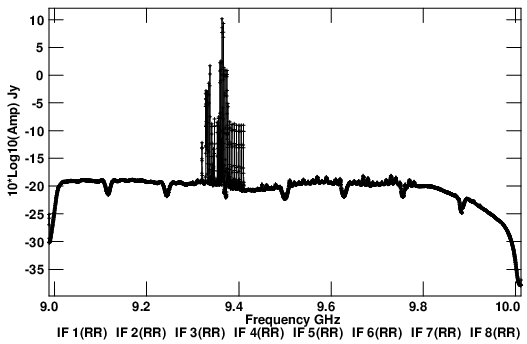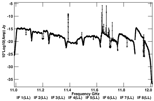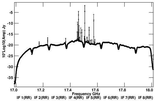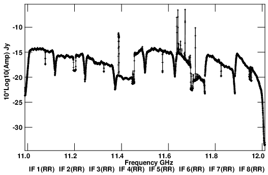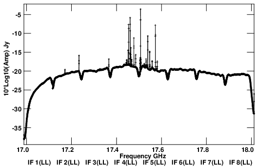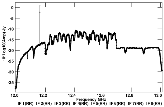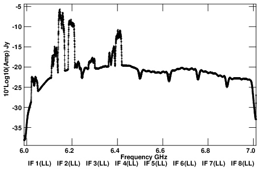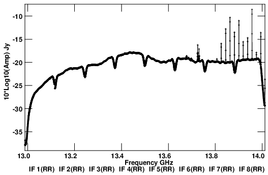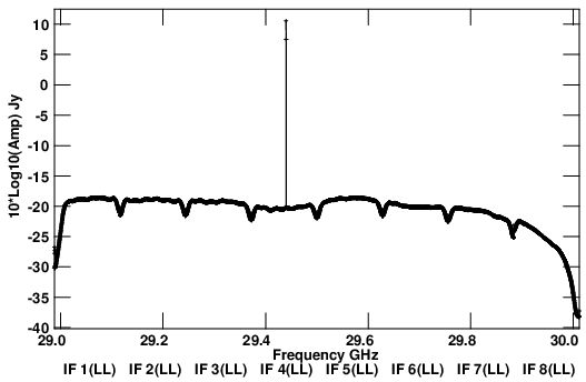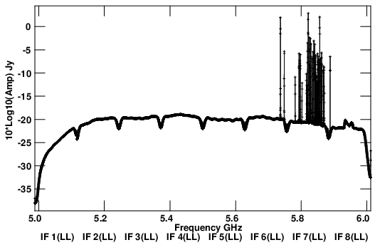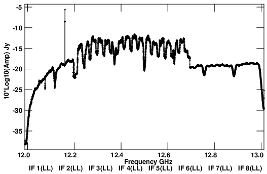 In addition, each link contains .CSV files. These files contain the values needed to plot Amplitude vs Frequency for the RR and LL correlations. Similar to the above, the values are scalar-averaged cross correlations, Hanning smoothing has been applied, and no bandpass calibration has been performed. The amplitudes are in Janskys calibrated using the system temperature of the antennas. Due to the gain compression effect the reported values are better thought of as lower limits than absolute fluxes of the RFI.