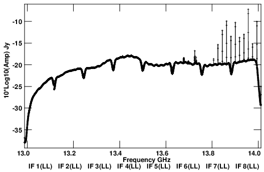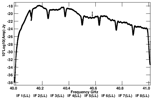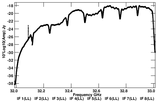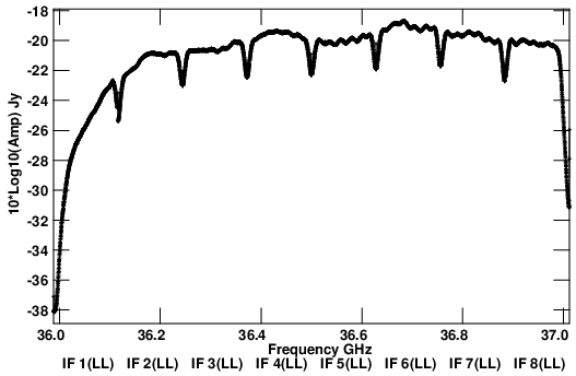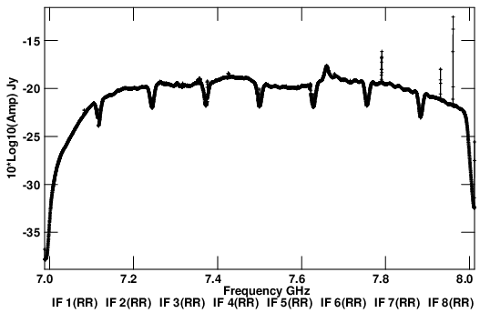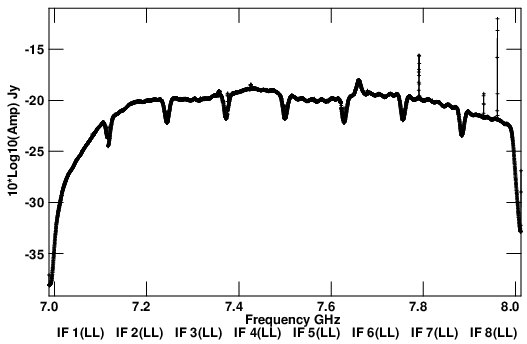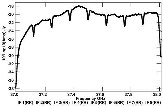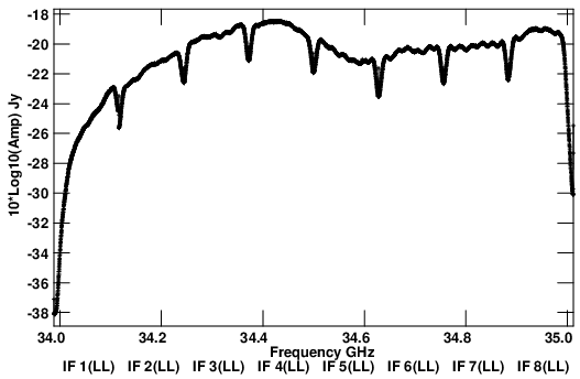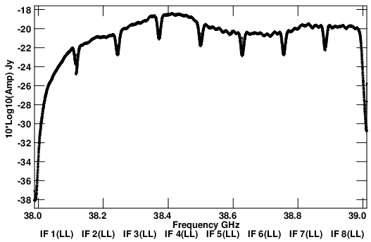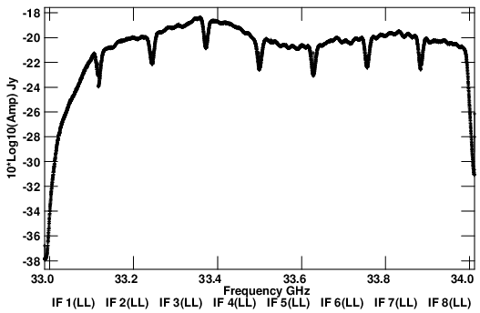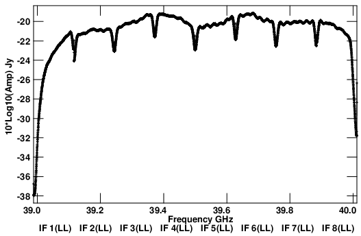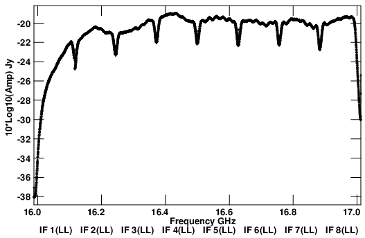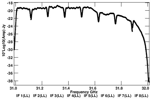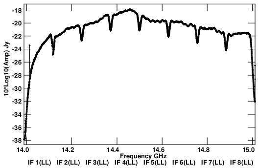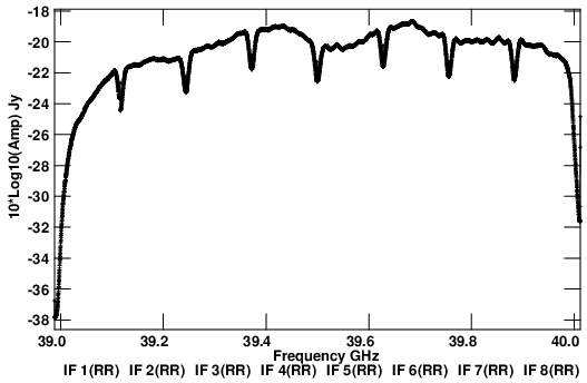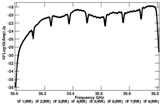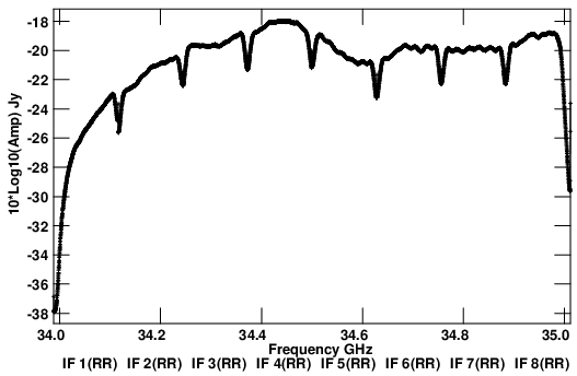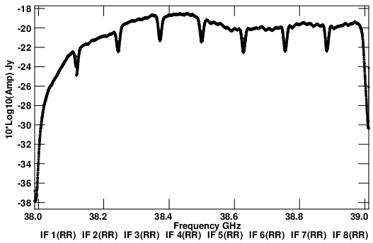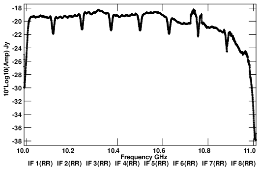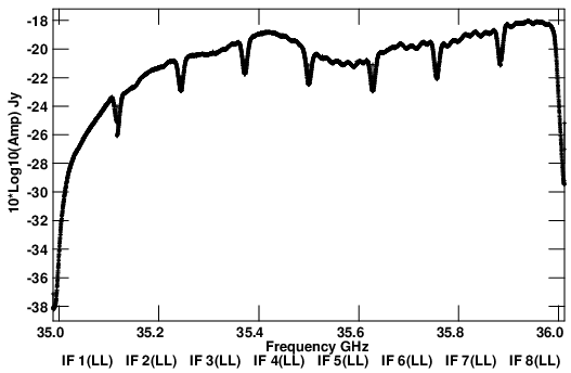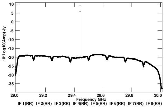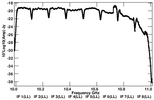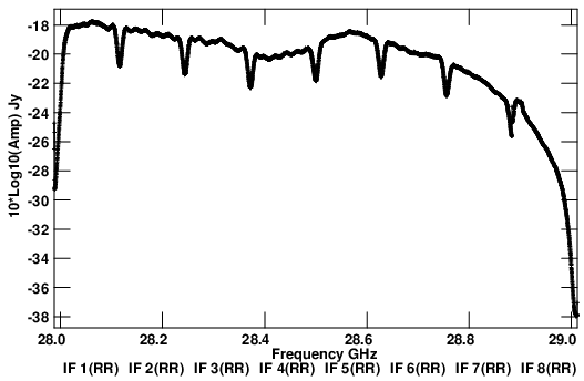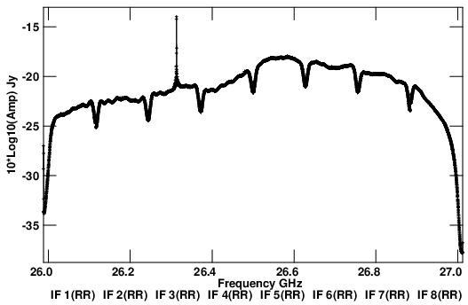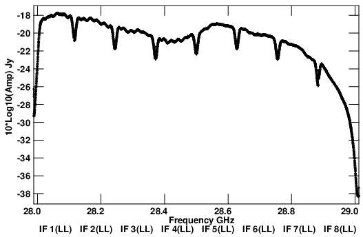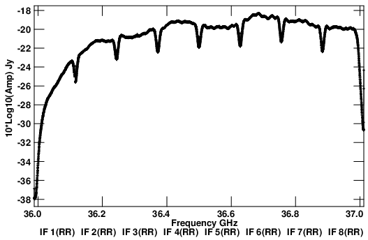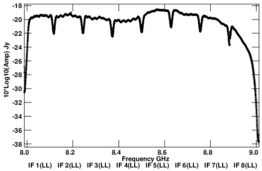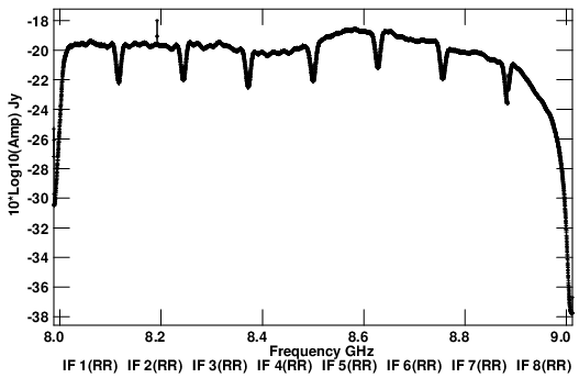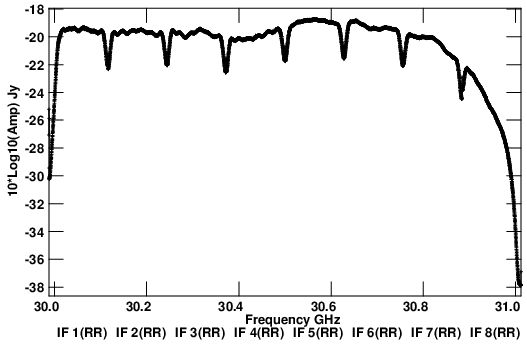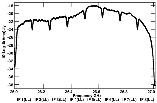 Each link in the list below presents scalar-averaged cross correlation spectra using several baselines in the C-configuration for each respective receiver band obtained in 2025's C-configuration. The channel separation is 125 kHz. The antennas are pointed to the north celestial pole and away from known RFI sources. Hanning smoothing has been applied to minimize Gibbs ringing. The scale is logarithmic, in dB, with arbitrary offset. The scale can be roughly calibrated by noting that the mean power level is roughly equal to the antenna SEFD in Jy. There is no bandpass calibration, so the downturns at the edges are due to the analog and/or digital filters.
