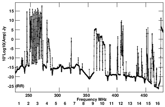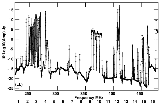 In addition, each link contains .CSV files. These files contain the values needed to plot Amplitude vs Frequency for the RR and LL correlations. Similar to the above, the values are scalar-averaged cross correlations, Hanning smoothing has been applied, and no bandpass calibration has been performed. The amplitudes are in Janskys calibrated using the system temperature of the antennas. Due to the gain compression effect the reported values are better thought of as lower limits than absolute fluxes of the RFI.