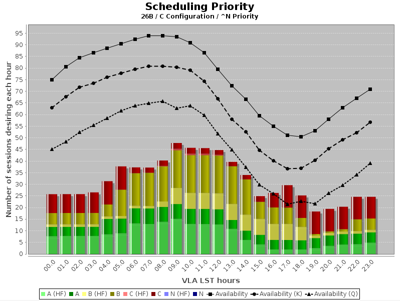 When constructing sessions in the PST, proposers should be cognizant of their use by the Telescope Time Allocation Committee (TAC). Specifically taking into account the time available as a function of LST, software will assign an initial scheduling priority to each session in each proposal, which can be modified by the TAC if they desire. The assigned scheduling priority will depend on the linear-rank score of the proposal from its scientific review, the LSTs involved in the session (daytime is harder to accommodate than nighttime, for instance), the predicted atmospheric conditions for observing over that LST range at the time of year of the configuration, the total time requested in the session, and the competition from other proposals requesting time at similar LSTs. Please see this description for guidance on how to set up sessions in the PST, and this document for a complete description of the VLA Prioritizer (the software that generates the initial scheduling priorities for all sessions that are subsequently used by the TAC to derive the final priorities).