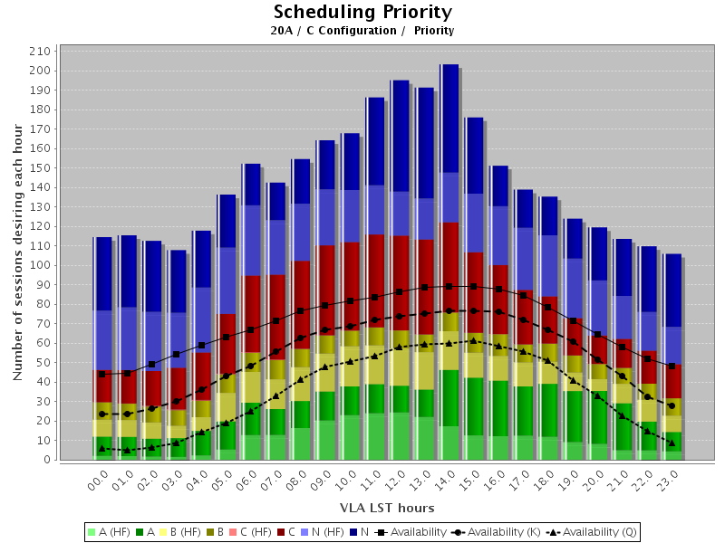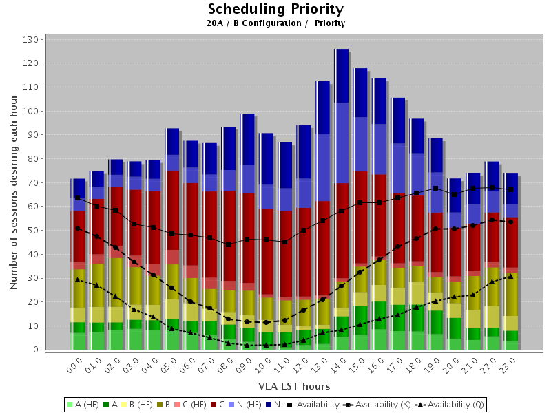 In semester 20A, daytime maintenance activities peak at about 10 and 0 hours LST for the B and C-configurations, respectively, so observing pressure is highest there. For status of the VLA and links to the monthly schedules please see the schedsoc home page. Proposals approved for priority A, B or C time become ineligible when the associated configuration ends, unless explicitly stated otherwise in the Comments from the TAC. Those allocated dynamic time should begin their scheduling block preparation about two weeks before the planned start of the configuration (see Configuration Plans).