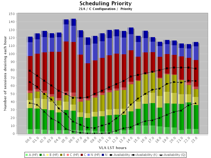 In semester 21A, daytime maintenance activities peak at about 01 hours and 09 hours LST for the D and C-configuration, respectively, so observing pressure is highest there. For status of the VLA and links to the monthly schedules please see the schedsoc home page. Any approved time may be divided into multiple scheduling blocks as appropriate, considering the scheduling priority, observing frequency, LST range suitable for the target(s), and LST pressure. In order to optimize the likelihood that the project will be completed, proposers should try to maximize the LST range SBs can be observed within the approved LST range. For advice, please consult the VLA Observing Guide.
