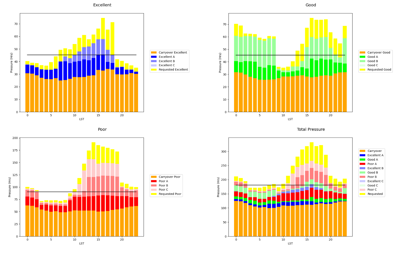 Pressure plots show the total hours of allocated time as a function of LST (or GST). Also shown are how the hours are divided with respect to weather conditions and observing priority. Click on the plot to enlarge.