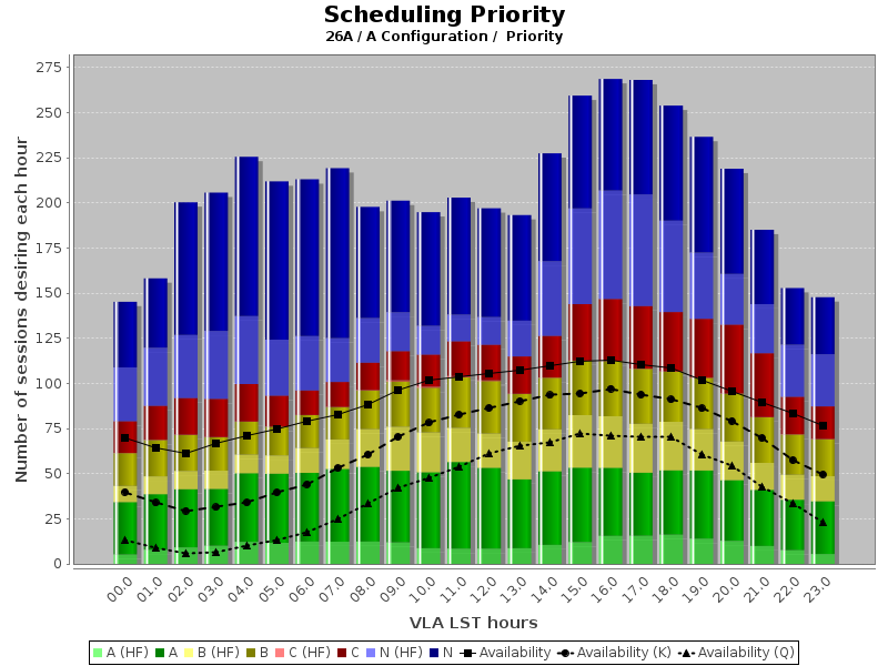 The VLA Prioritizer is software that generates the initial scheduling priorities for all sessions that are subsequently used by the TAC to derive the final recommended priorities. The TAC can and does change the priorities suggested by the Prioritizer. Also note that sometimes the Prioritizer cannot follow these rules strictly because of the composition of the proposals submitted. For semester 26A, the following rules were adopted as input to the VLA Prioritizer: