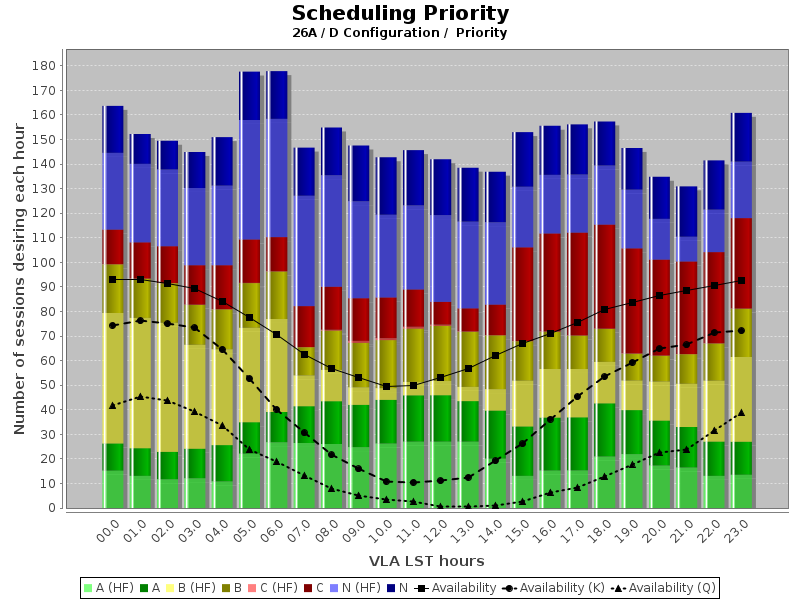 In semester 26A, for A and D-configurations daytime maintenance activities peak at about 02:00 and 10:00 hours LST, respectively, so the available observing time is least in and around this LST. For status of the VLA and links to the monthly schedules please see the schedsoc home page. For advice on preparing scheduling blocks, please consult the VLA Observing Guide or use the helpdesk.