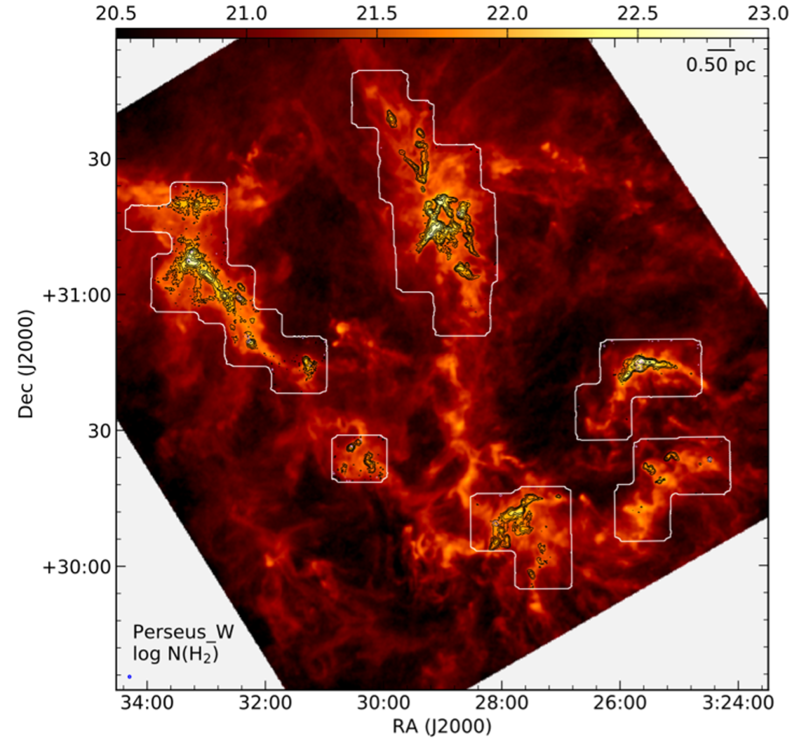 Green Bank Ammonia Survey in the Perseus molecular cloud at 32’’ resolution (Black contours, Pineda et al. arXiv:2510.0607). The color scale shows N(H2) derived from Herschel.